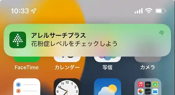 | 1)通知機能 花粉症対策は、「症状が出てから」ではなく「継続的な予防・ケア」が重要です。本アップデートでは、ユーザーが日々の対策を継続できるよう、花粉症レベルチェックを促す通知機能を追加しました。これにより、忙しい日常の中でも無理なく花粉症ケアを続けられるようサポートします。 | |||