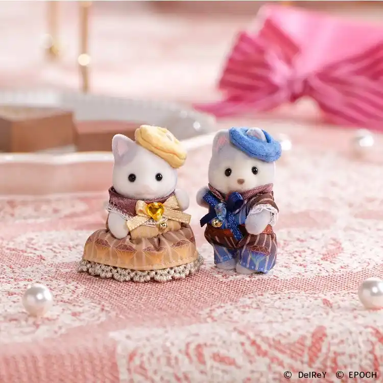 中でも注目は、「シルバニアファミリー×デルレイ ラテネコの赤ちゃん&ハスキーの赤ちゃん -ダイヤモンドショコラ-」。ダイヤモンド型のチョコレートが人気のデルレイ。そんなデルレイのアイコンでもあるダイヤモンド型のショコラをモチーフにした特別なドレスの赤ちゃんのペアセットです。 |