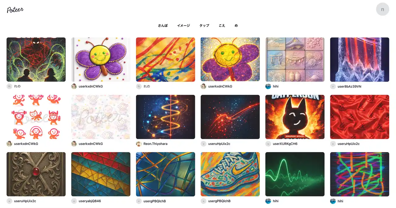 Poteerは、散歩や視線の動き、描画などの日常のアクションをAIが解析し、デザインやビジュアル素材に変換するクリエイティブプラットフォームです(特許申請中)。 日常の行動がそのまま仕事となり、障害のある方がデザイナーとして社会に参画し、継続的に収益を得る仕組みを提供します。 |
