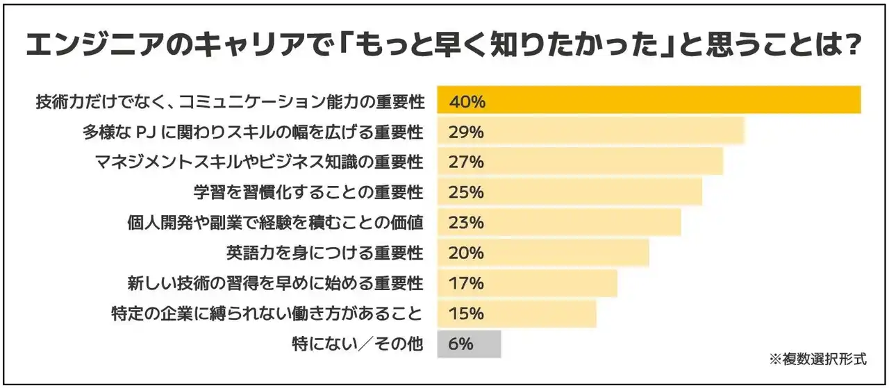 「エンジニアのキャリアで『もっと早く知りたかった』と思うことは?」(複数回答形式)という設問に対しても、コミュニケーション能力の重要性を指摘するエンジニアがもっとも多くなっています。 |