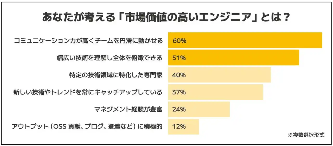 「あなたが考える市場価値の高いエンジニアとは?」(複数回答形式)という設問では、「コミュニケーション力」が最上位要件にあげられており、約6割のエンジニアが賛同。これは従来型のエンジニア像に近い、「特定の技術領域に特化した専門家」を選んだ約4割を大幅に上回っています。 |