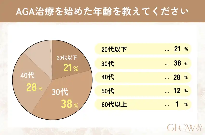 | AGAオンライン診療を始めた年齢について、「30代」という回答が38%で最も多い結果でした。 | ||||||||||||||||||