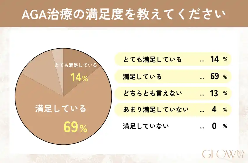 | AGAオンライン診療の満足度については、「とても満足している」(14%)と「満足している」(69%)を合わせて83%という結果でした。 | ||||||||||||||||||