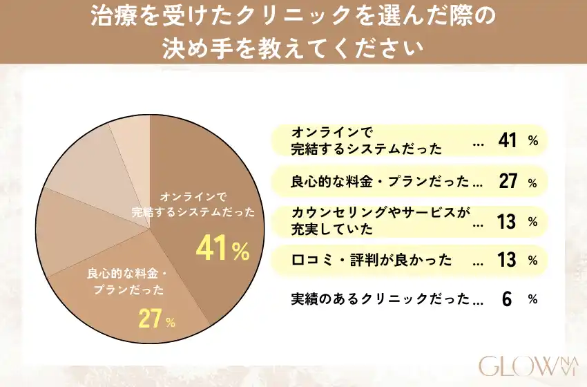 | AGAオンライン診療のクリニックを選んだ際の決め手について、「オンラインで完結するシステムだった」という声が41%で最も多く集まりました。 | ||||||||||||||||||