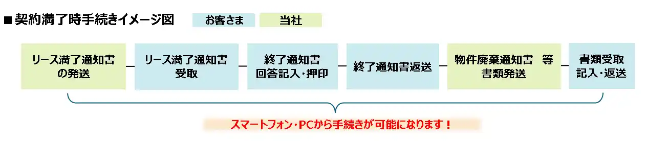 そして更なるお客さまの利便性向上を目指し、2025年10月より新たに「契約満了時手続き機能」を追加しました。この機能によって、リース契約満了時にこれまで紙媒体の郵送で行っていた手続きをWEB上で完結することが可能となります。 |