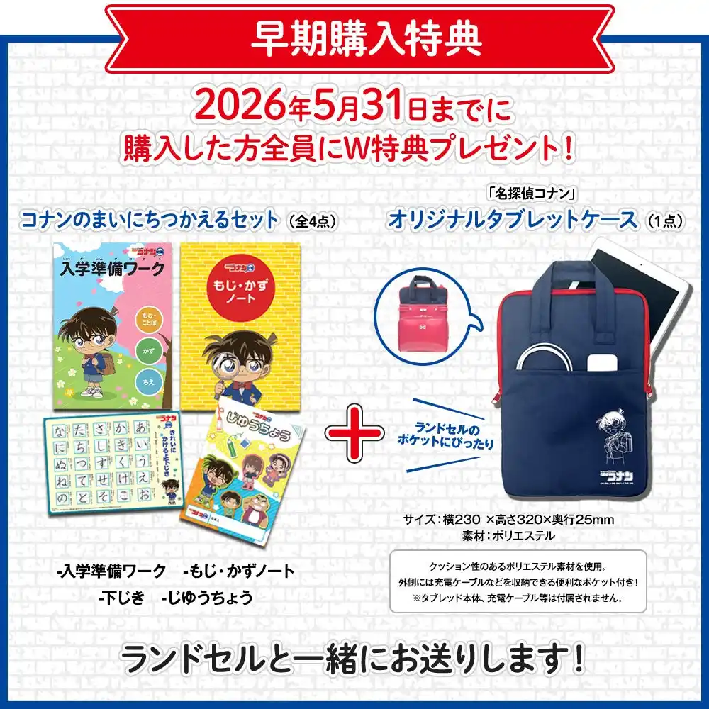 さらに、2026年1月23日~5月31日の期間中にご注文いただいた方には早期購入特典として、上記「オリジナルタブレットケース」に加え、入学準備に役立つワークブックや自由帳など、全4アイテムをセットにした「コナンのまいにちつかえるセット」を同梱してお届けします。 |