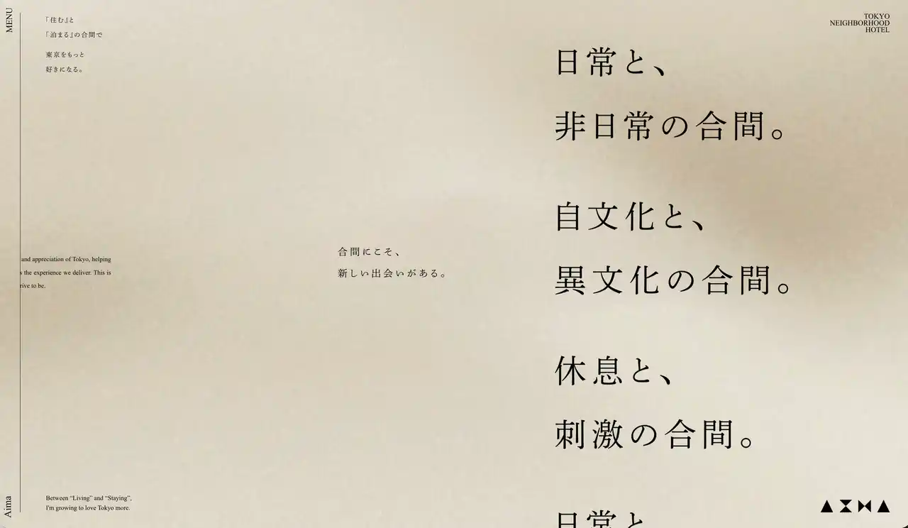 | 新サイトでは、AIMAが提供したい東京の近所(Neighborhood)に滞在する体験を、より直感的に理解できる情報設計へ刷新しました。今後、各エリアのディープな魅力を紹介するコンテンツや、ホテルの詳細について順次公開していく予定です。 | ||||||||||||||