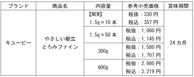 キユーピー株式会社(本社:東京都渋谷区、代表取締役 社長執行役員:高宮 満、以下キユーピー)は、「やさしい献立」シリーズの「とろみファイン」から、初めての方でも手に取りやすい10本入りを2026年3月5日(木)から新発売します。また、既存の3品についてもパッケージデザインをリニューアルします。 |