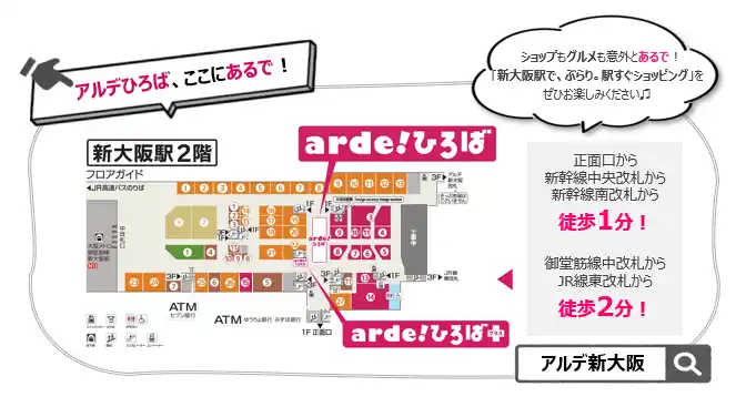 | 「アルデ新大阪」は、大阪・関西の玄関口である新大阪駅の2階(改札外)にあるショッピングセンター。 | ||||||||||||||||