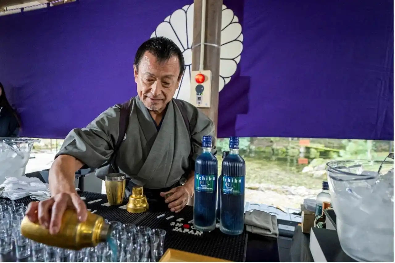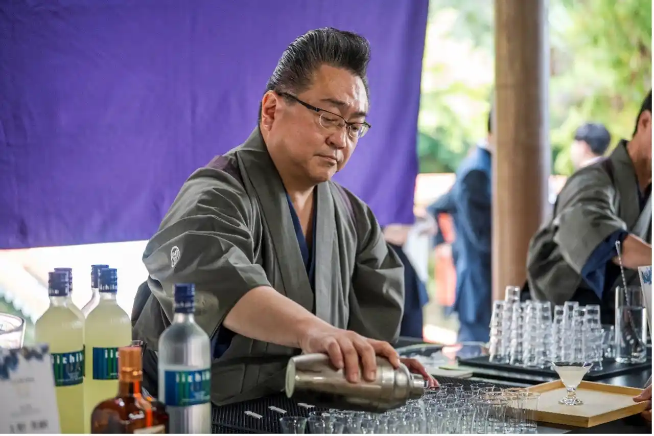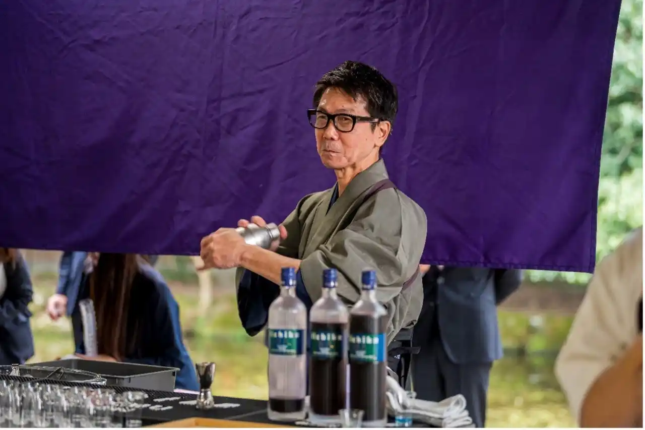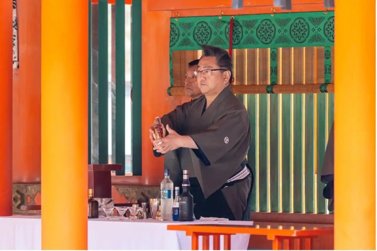 紋付袴でシェーカーを振るう姿は、神域という特別な空間において、世界のカクテル文化と日本の焼酎文化が高い次元で融合する様子を象徴するものとなりました。 |