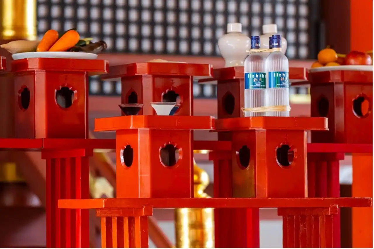 祭壇には、奉納された「iichiko彩天」とともに、グラスに注がれた3種のカクテルが供えられました。厳粛な神域において、伝統と革新が融合した光景です。 |