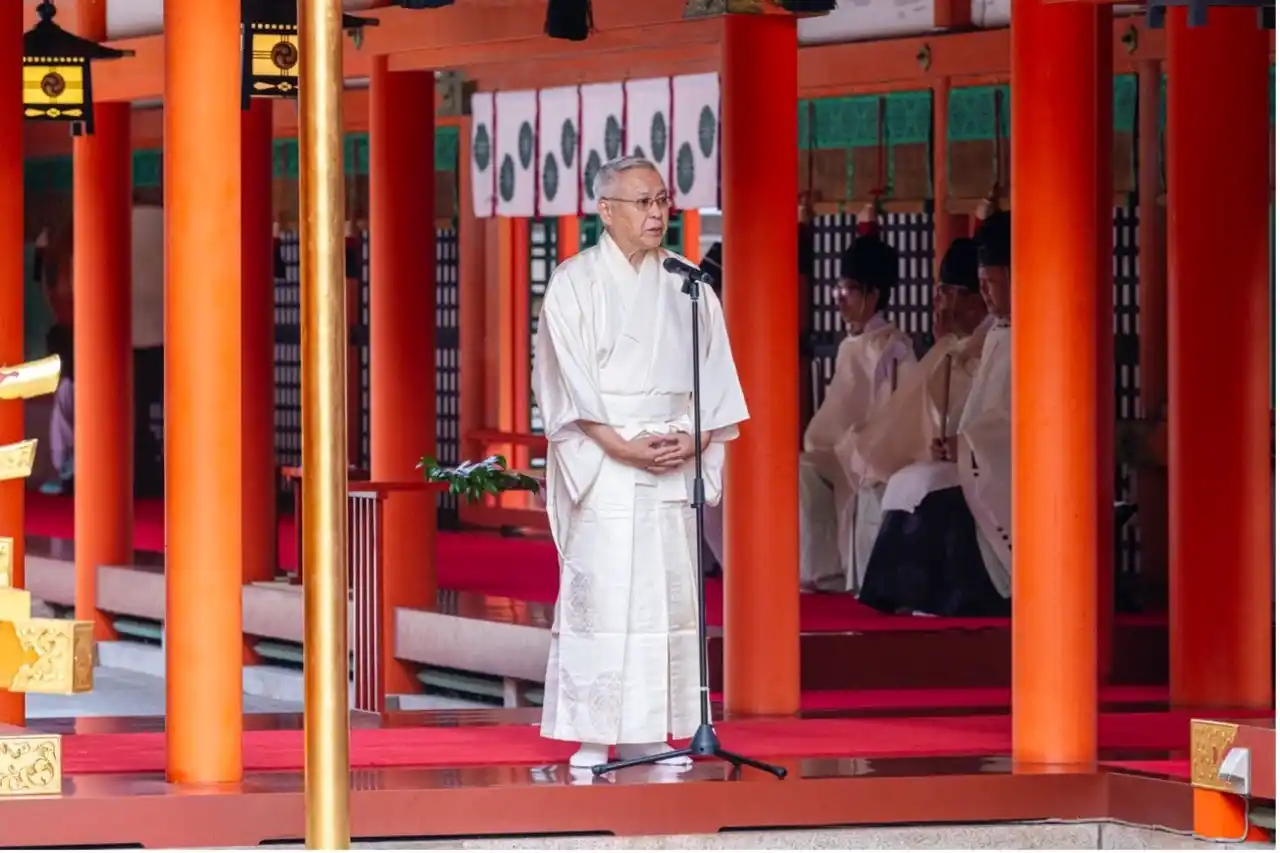 「本年は宇佐神宮において、ご鎮座1300年という極めて重要な節目の年でございます。これまで恒例としてきたお花やお茶の奉納とは異なり、カクテルをご奉納いただくということは、宇佐神宮始まって以来、初のことでございます。この度、バーテンダーの方がシェーカーを振る音が、これほどまでに神々しいものであるのかと、初めて実感させていただきました。本日執り行いました祈願奉納祭をもちまして、『iichiko彩天』がここから世界に向けて発売され、皆様方に深く親しまれるお酒となりますよう、衷心より祈念いたします。」 |