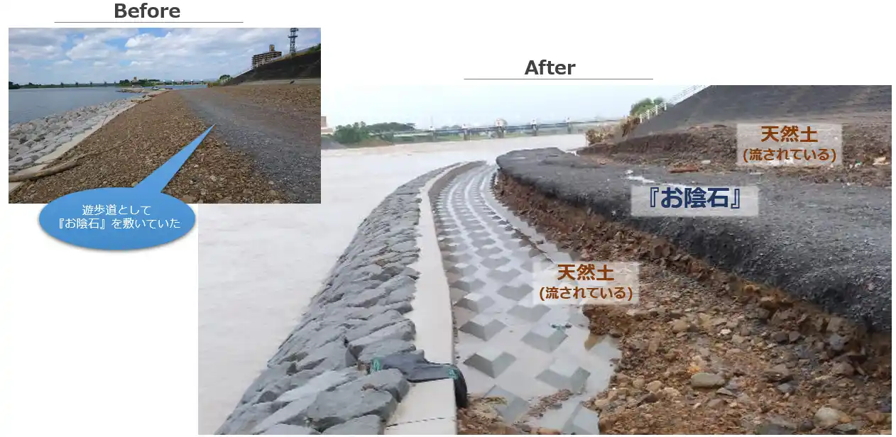 2020年の熊本大豪雨では、球磨川河川敷の遊歩道に使われていた「お陰石」が流されずに残っていたことによって、「お陰石」の水害の強さを実証され、「お陰石」は熊本県リサイクル製品第一号に認定されました。 |