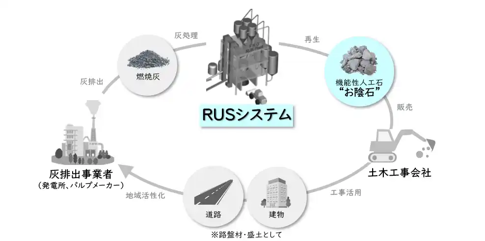 「RUSシステム」とは、当社とのライセンス契約により、全国にある発電所などの燃焼灰を「お陰石」を製造する必要なノウハウを遠隔で当社がサポートし、パートナー企業は「お陰石」を製造する設備を設置して、地域で排出された燃焼灰から「お陰石」を製造することができます。すでに2022年に宮崎県でパートナー企業が稼働しており、2025年以降は佐賀県、福岡県でも稼働が計画されています。 |