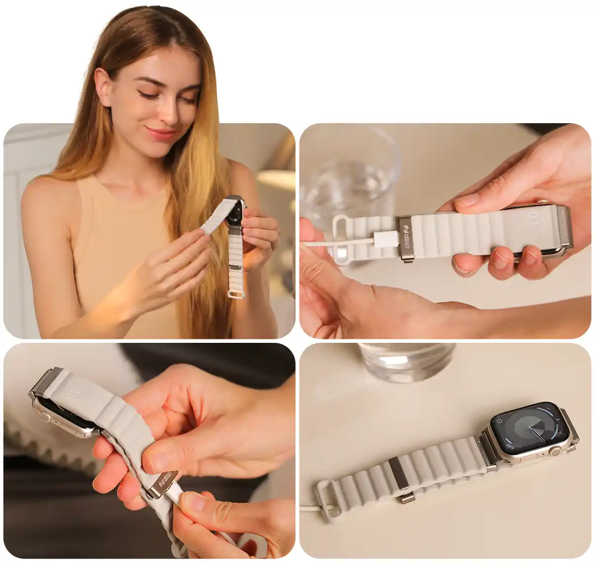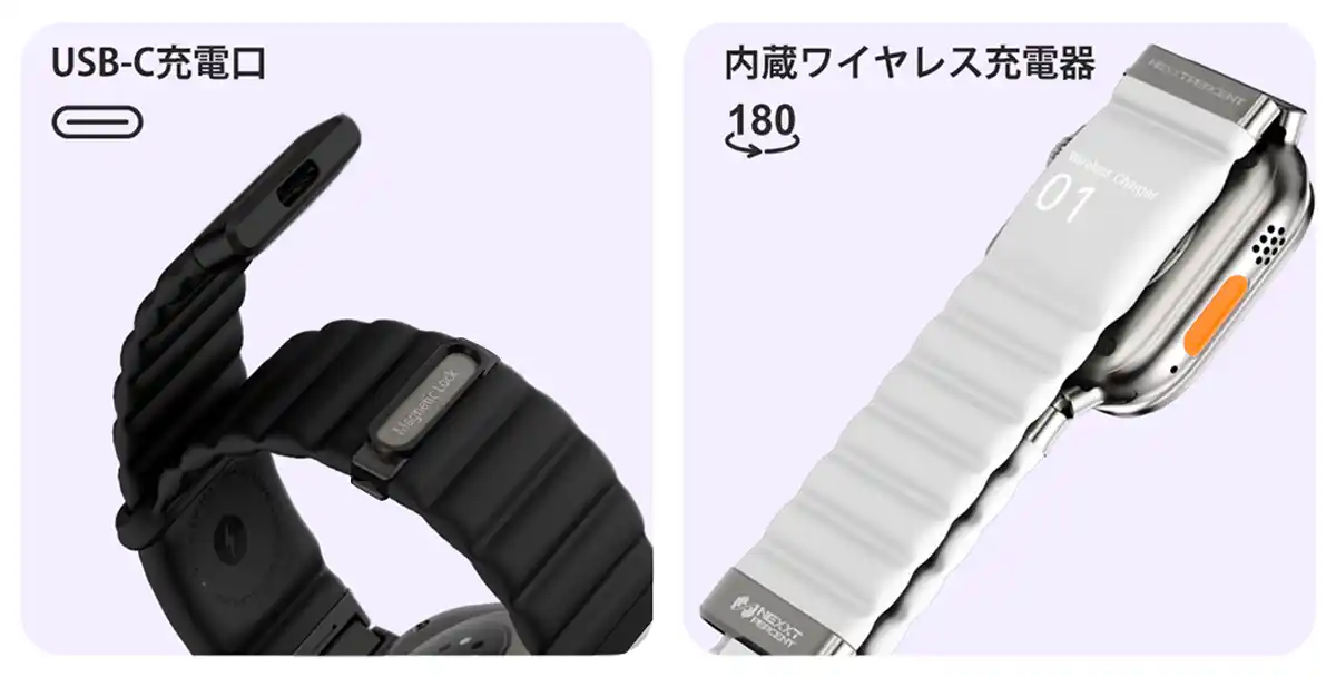 バンドにワイヤレス充電モジュールを内蔵し、USB-Cポート経由でApple Watchをスマートに充電できるよう設計されています。 |