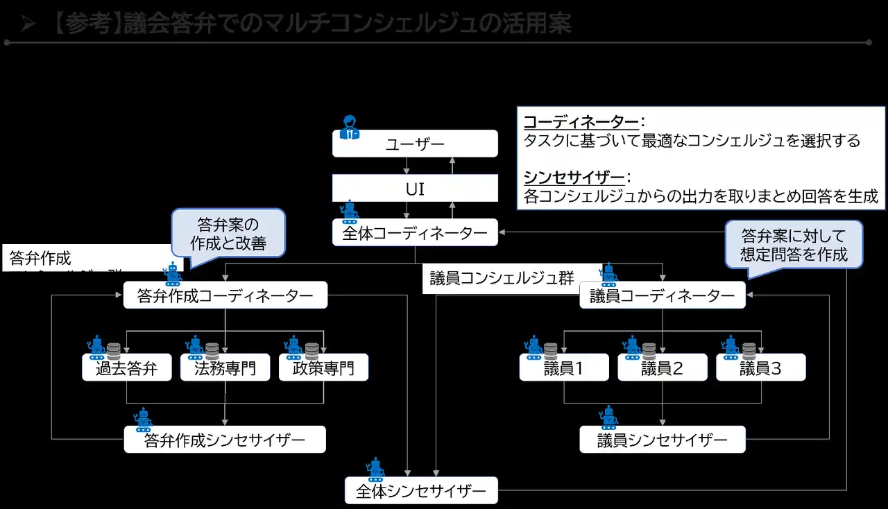 具体的には議会答弁案の作成支援など、質問内容に応じて参照するドキュメントを使い分け、業務に応じて品質の高い回答を提供します。条例や通告の内容を複合的に読み取り、最新状況に応じた回答を生成することが可能です。 また、業務の流れをAIが再現することで、従来のAIやシングルコンシェルジュでは難しかった柔軟かつ高度なタスク実行を実現します。例えば、街づくりにおける施策の検討など、複数の異なる意見やペルソナに対する議論や企画に対して、賛否・論点・想定反論・代替案を、それぞれ役割分担した複数のAIコンシェルジュで作成、要約するようなケースに有効です。 |