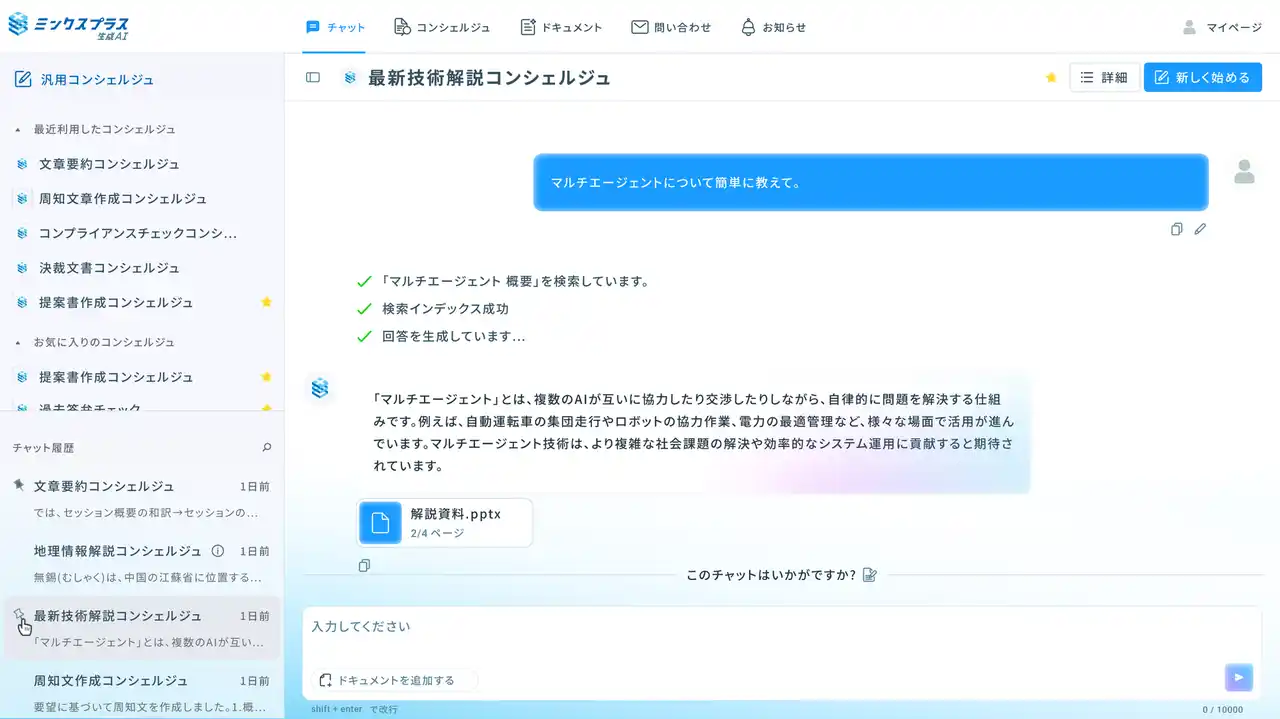 複数のAIエージェントが相互に連携、協調しながら複雑なタスクや問題の解決をサポートします。これにより、「高度な意思決定」など、複雑な業務プロセスにおいて活用効果を実感していただけます。 |