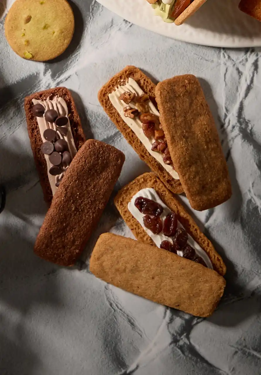 芳醇でコク深いヘーゼルナッツパウダーを練りこんだサブレ生地に、くちどけなめらかなホワイトチョコクリームと、上品な香りと旨味が詰まったラム酒漬けレーズンをサンドしました。 |