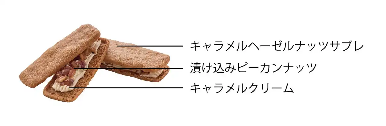 キャラメル風味のちょっぴりビターなヘーゼルナッツサブレ生地に、優しい甘さのキャラメル クリームと、まろやかな風味のシロップ漬けピーカンナッツをサンドしました。 |