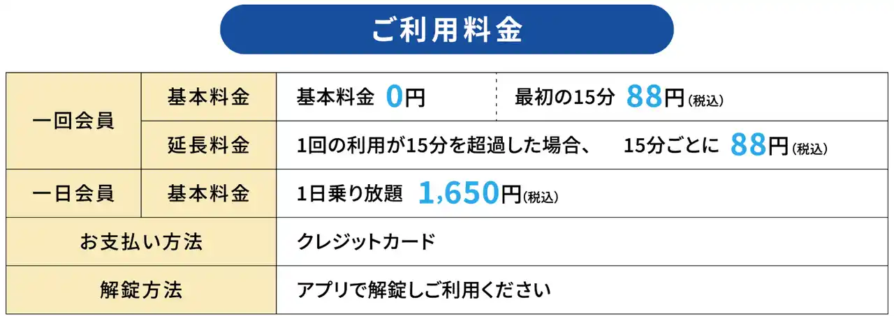| 「少しだけ乗りたい」「一日しっかり使いたい」どちらのニーズにも対応できる料金設定です。 | |||||||||||||||