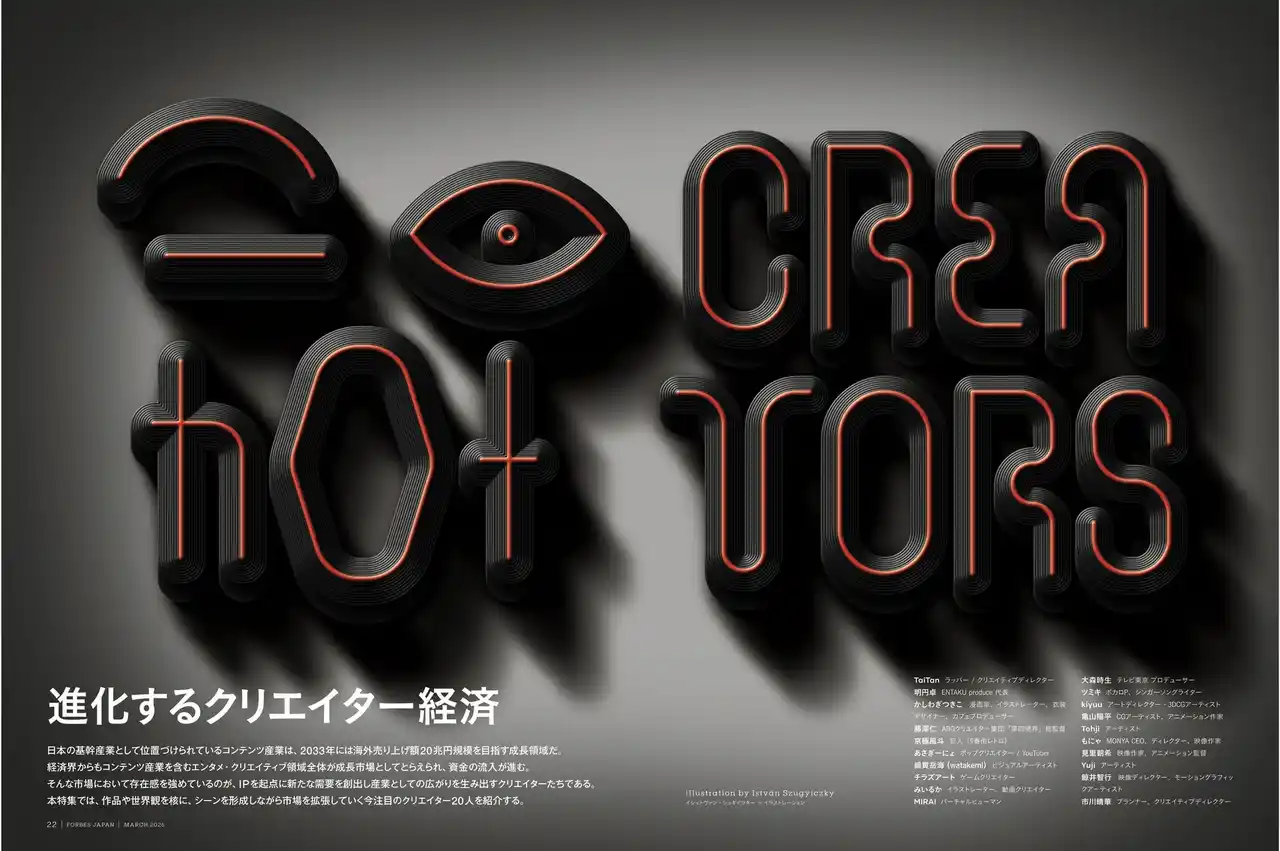 | Forbes JAPANが初のクリエイター特集である「20 HOT CREATORS 進化するクリエイター経済」。日本の基幹産業として位置づけられているコンテンツ産業は、2033年には海外売り上げ額20兆円規模を目指す成長領域。経済界からもコンテンツ産業を含むエンタメ・クリエイティブ領域全体が成長市場としてとらえられ、資金の流入が進む。そんな市場において存在感を強めているのが、IPを起点に新たな需要を創出し産業としての広がりを生み出すクリエイターたちである。本特集では、作品や世界観を核に、シーンを形成しながら市場を拡張していく今注目のクリエイター20人を紹介する。 | |||||||||