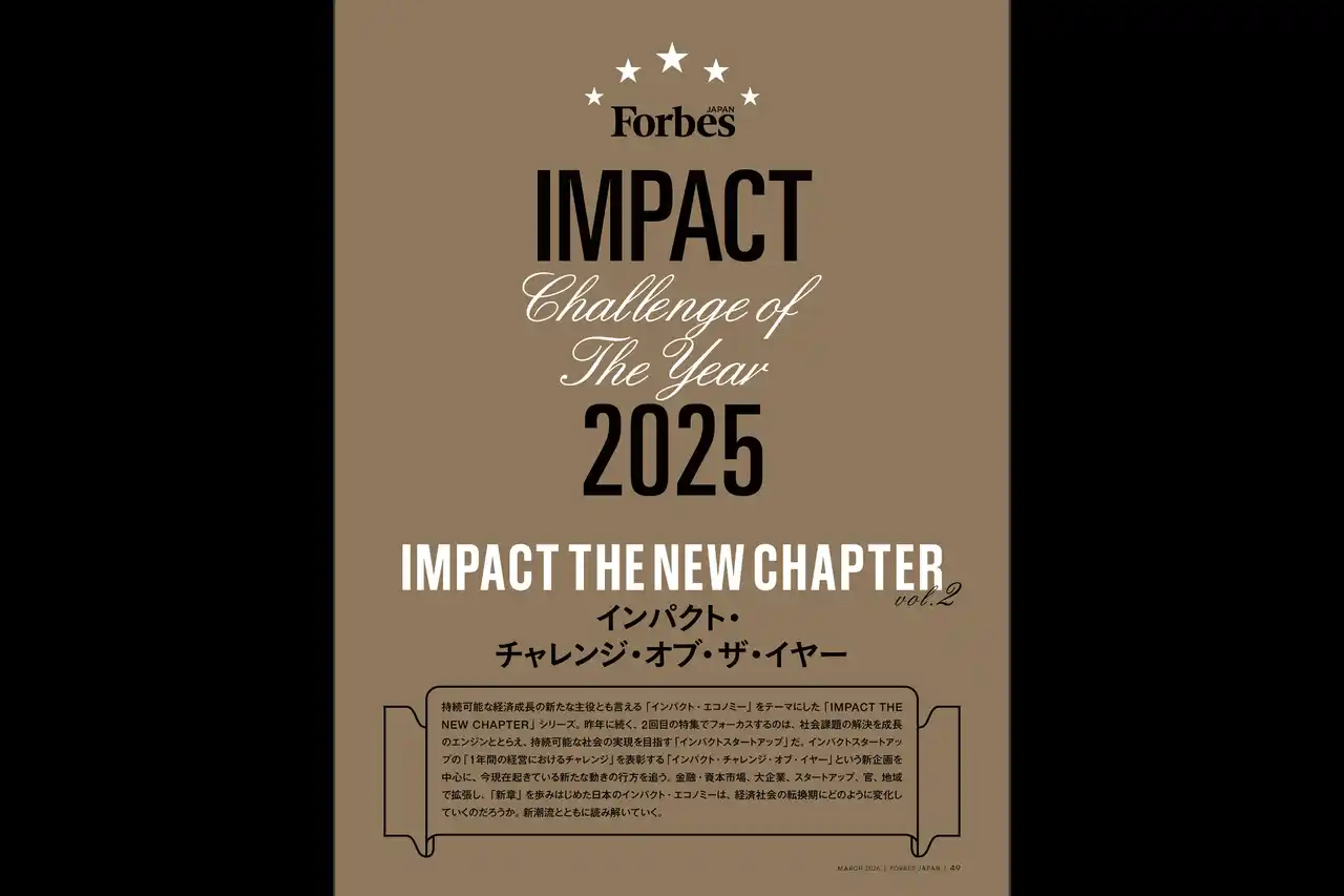 | 「新たな豊かさ」を生み出し、持続可能な経済成長の新主役とも言える「インパクト・エコノミー」をテーマにした「IMPACT THE NEW CHAPTER Vo.2」。今回、フォーカスするのは、社会課題の解決を成長のエンジンととらえ、持続可能な社会の実現を目指す「インパクトスタートアップ」だ。インパクトスタートアップの「1年間の経営におけるチャレンジ」を表彰する「インパクト・チャレンジ・オブ・イヤー」という新企画を中心に、金融・資本市場、大企業、スタートアップ、官、地域で拡張し、「新章」を歩みはじめた日本のインパクト・エコノミーの新潮流を読み解いていく。 | |||||||||