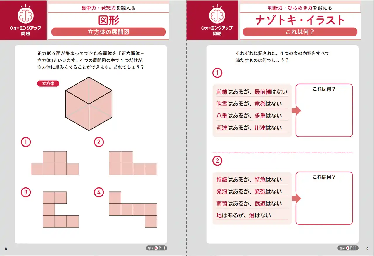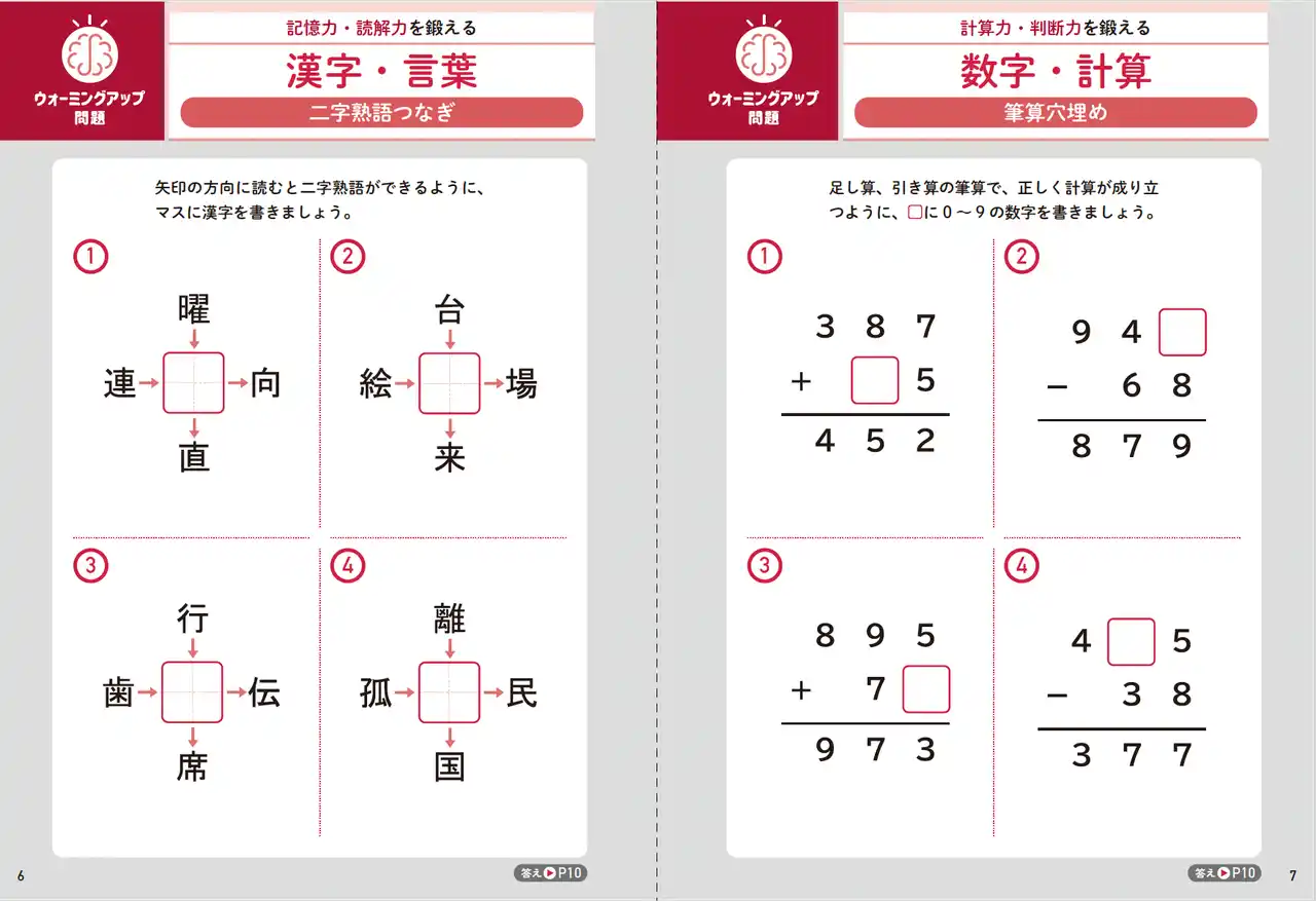 「漢字・言葉」「数字・計算」「図形」「ナゾトキ・イラスト」の問題をくり返し出題。漢字では記憶力、計算では判断力、図形では集中力、ナゾトキ・イラストでは発想力──。それぞれに働く脳の部位が違うため、あきることなく脳の総合力を自然に鍛えられます。 |