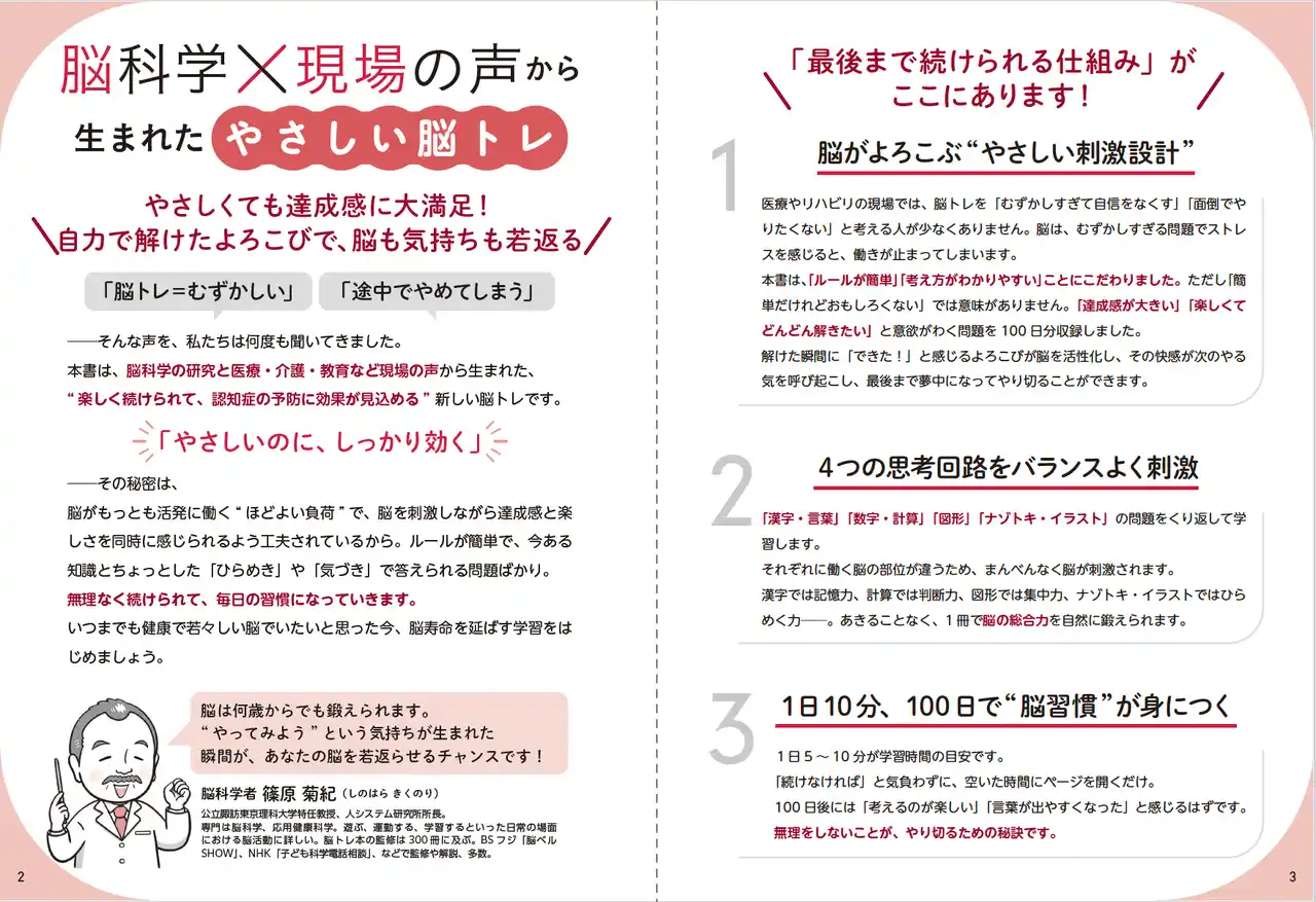 ■タイトル:『大きな文字で見やすく、解きやすい!脳科学者がすすめるやさしい脳活ドリル100日』 |