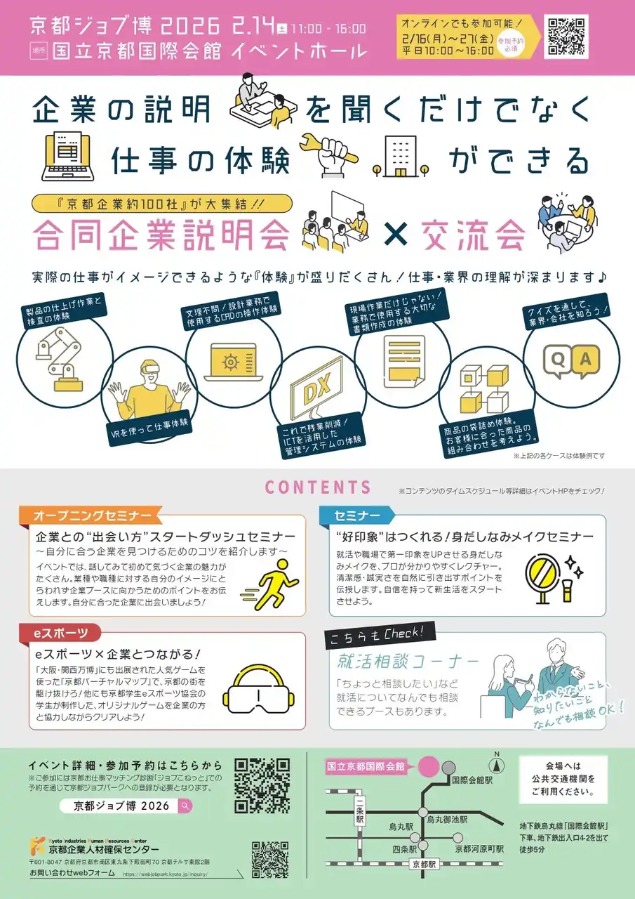 ■京都府では、学生等若年求職者に対し、働きやすい職場環境づくりに取り組む府内企業の企業研究を促進するため、約100社が参加する大規模イベント「京都ジョブ博2026」を2月14日(土)に、国立京都国際会館で開催します。 |