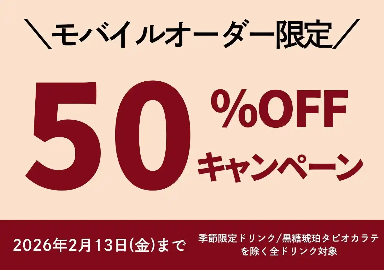 内容:モバイルオーダーでご注文のお客様限定!ドリンク50%オフキャンペーン