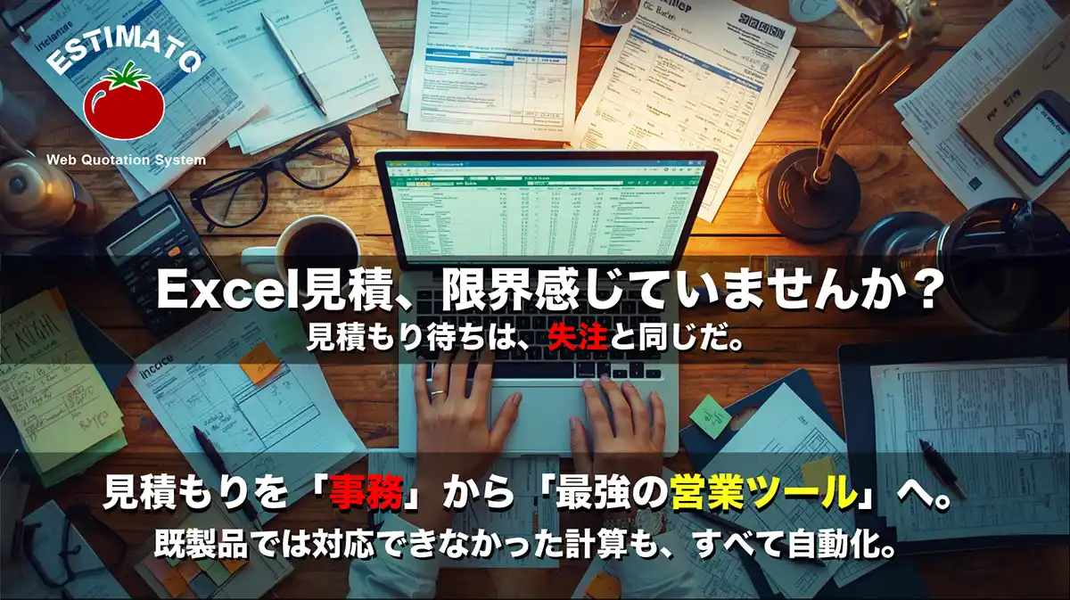 ●それらに加え、見積もりを待たせている間に競合に案件を奪われる「機会損失」←3分で解決! ●追加作業を請求できない「無償対応の常態化」←自動的に確認が残るから解決! ●そしてExcel職人の退職で業務が完全停止する「ノウハウの私物化」←誰でも簡単にどこでも見積が送れますので解決!