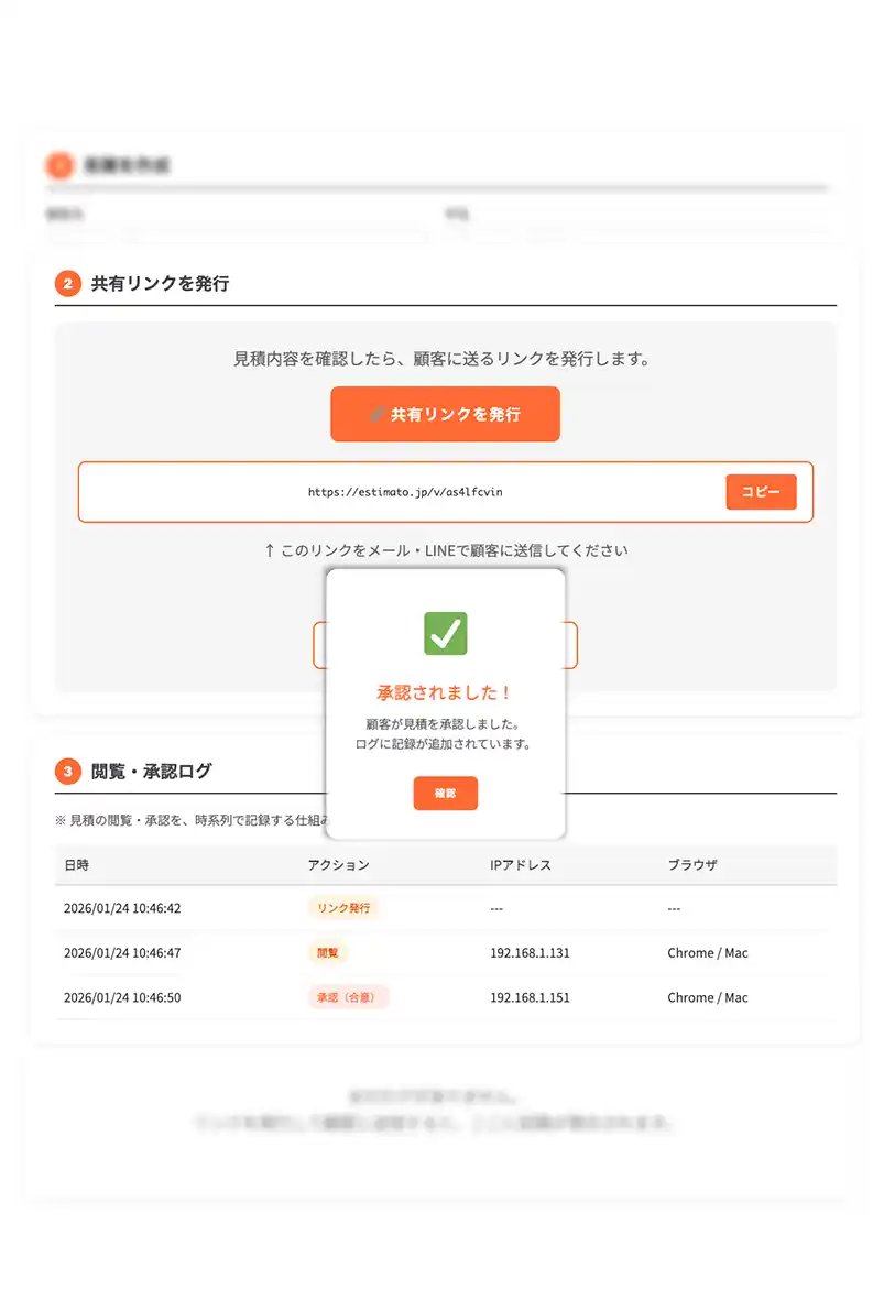 合意ログ: 「見ました」「OKです」を自動記録。お互いの確認が残る安心(おまもり機能)。 |
