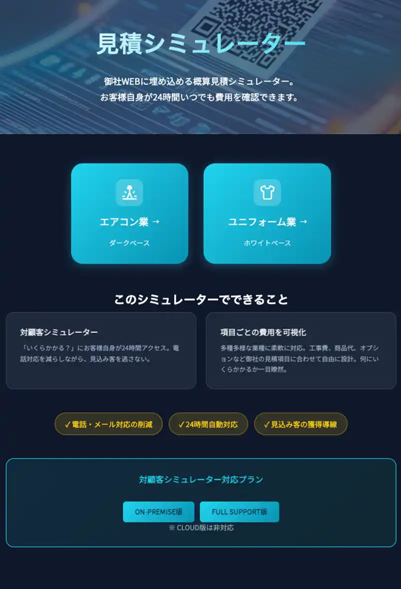 対顧客シミュレーター: Webサイトに埋め込み。深夜・休日でも概算し、見込み客を逃がさない。 |