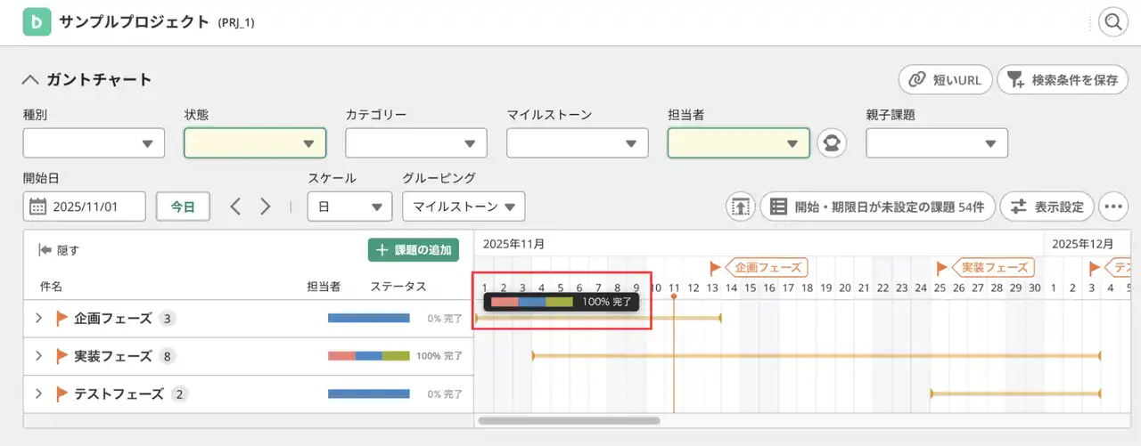 グルーピングした課題のバーにカーソルを合わせると課題の完了率が表示される |