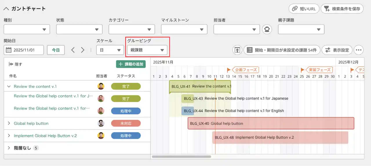 グルーピング表示時の表示方法および、折りたたみ/展開時のUIを改善予定です。これにより、グルーピングされた項目の行や、課題のバーにカーソルを合わせた際に、課題の完了率が表示されます。 |