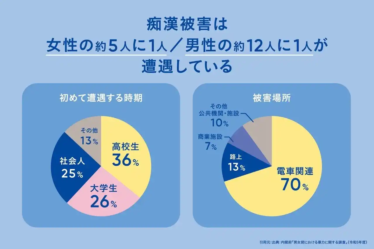 痴漢は決してめずらしいことではありません。調査によると、女性の約5人に1人、男性では約12人に1人が、生涯のうちに痴漢被害を経験しています。初めて被害に遭う時期として最も多いのは高校生、次いで大学生です。(出典:東京都 令和6年度 痴漢被害実態把握調査) |