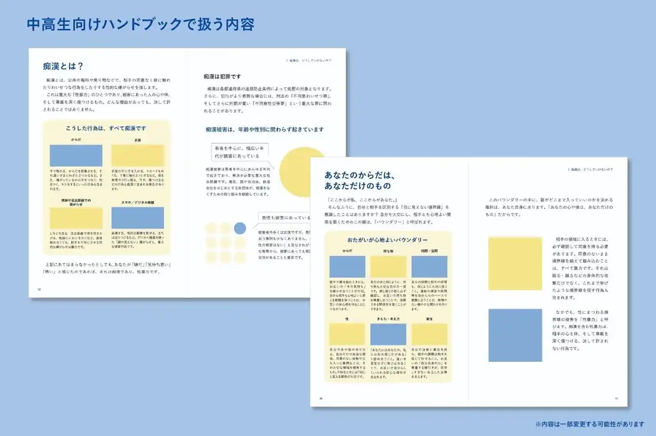 心理士監修の元で、中高生に痴漢についてのハンドブックを届ける。 |