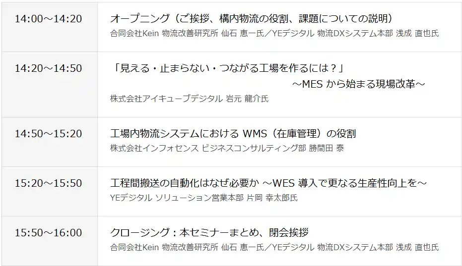 株式会社インフォセンス(本社:福岡市博多区、代表取締役社長:辛島 信司、以下 インフォセンス)は、株式会社YEデジタル(本社:北九州市小倉北区、代表取締役社長:玉井裕治、以下、YEデジタル)が2026 年 2 月 18 日(水)に開催するオンラインセミナー 「製造業の現場課題をどう解決する? ~MES・WMS・WES のパッケージ連携で変わる構内物流~」 において、WMS(在庫管理システム)をテーマとした講演を行います。 |