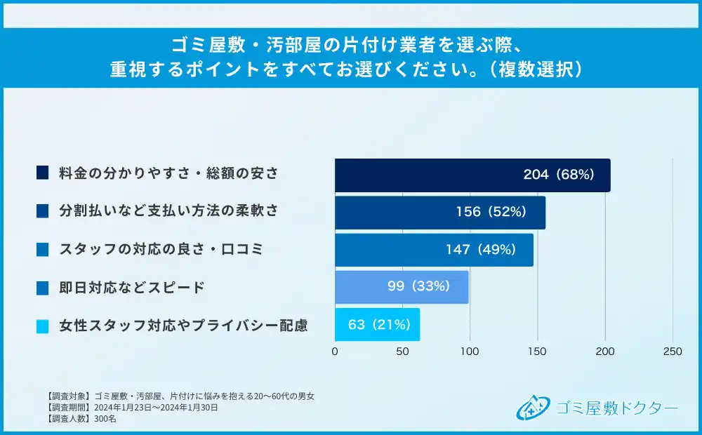 ゴミ屋敷・汚部屋の片付け業者を選ぶ際、重視するポイントをすべてお選びください。 |