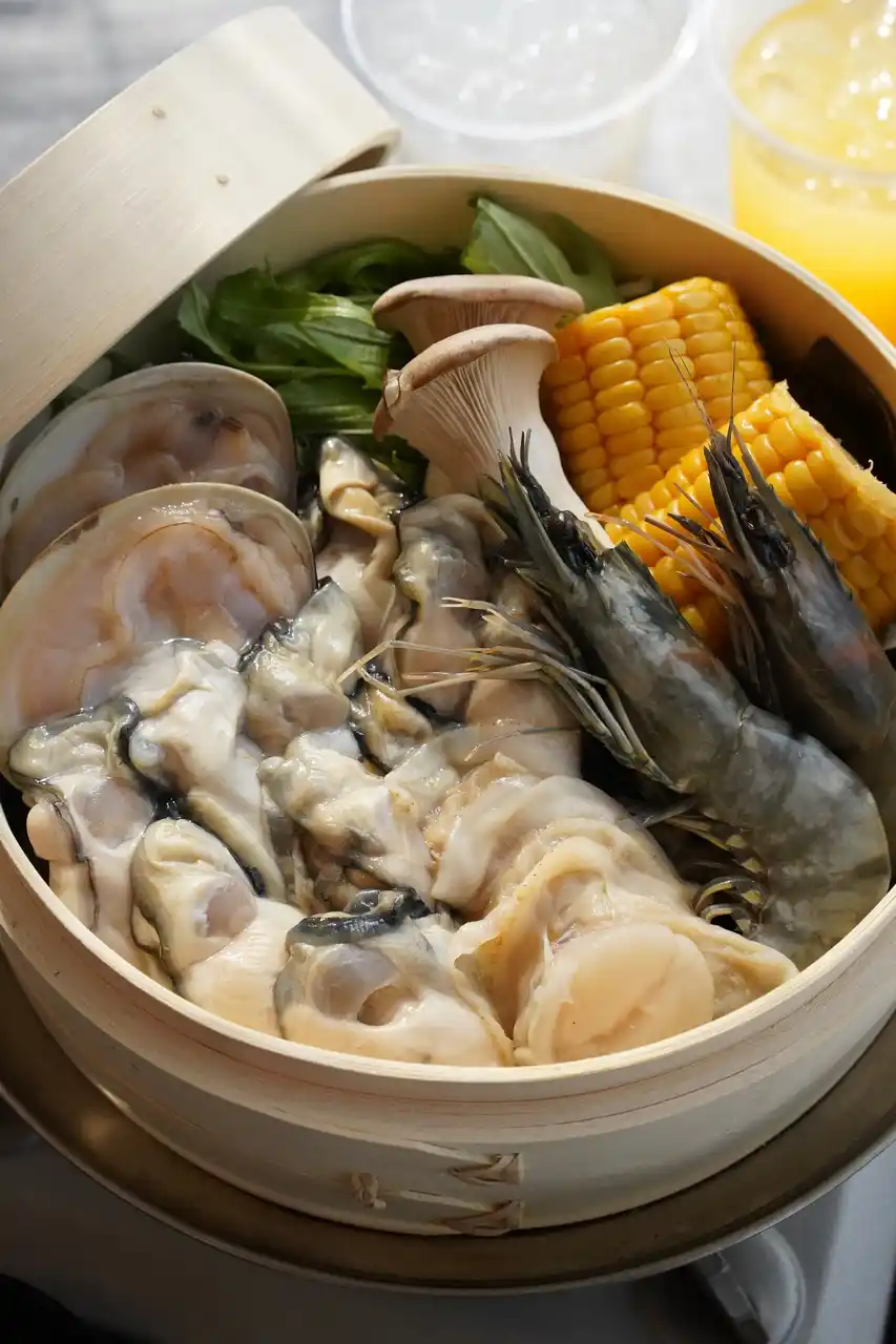 牡蠣・エビ・ホタテ・白はまぐり・コーンを、昆布を敷いたせいろでふっくら蒸し上げることで、素材の旨みを逃がさず、香り豊かに仕上げました。 せいろの下段には料理酒を使用し、昆布の香りと酒の風味をまとった、プリプリでジューシーな食感が魅力です。 |