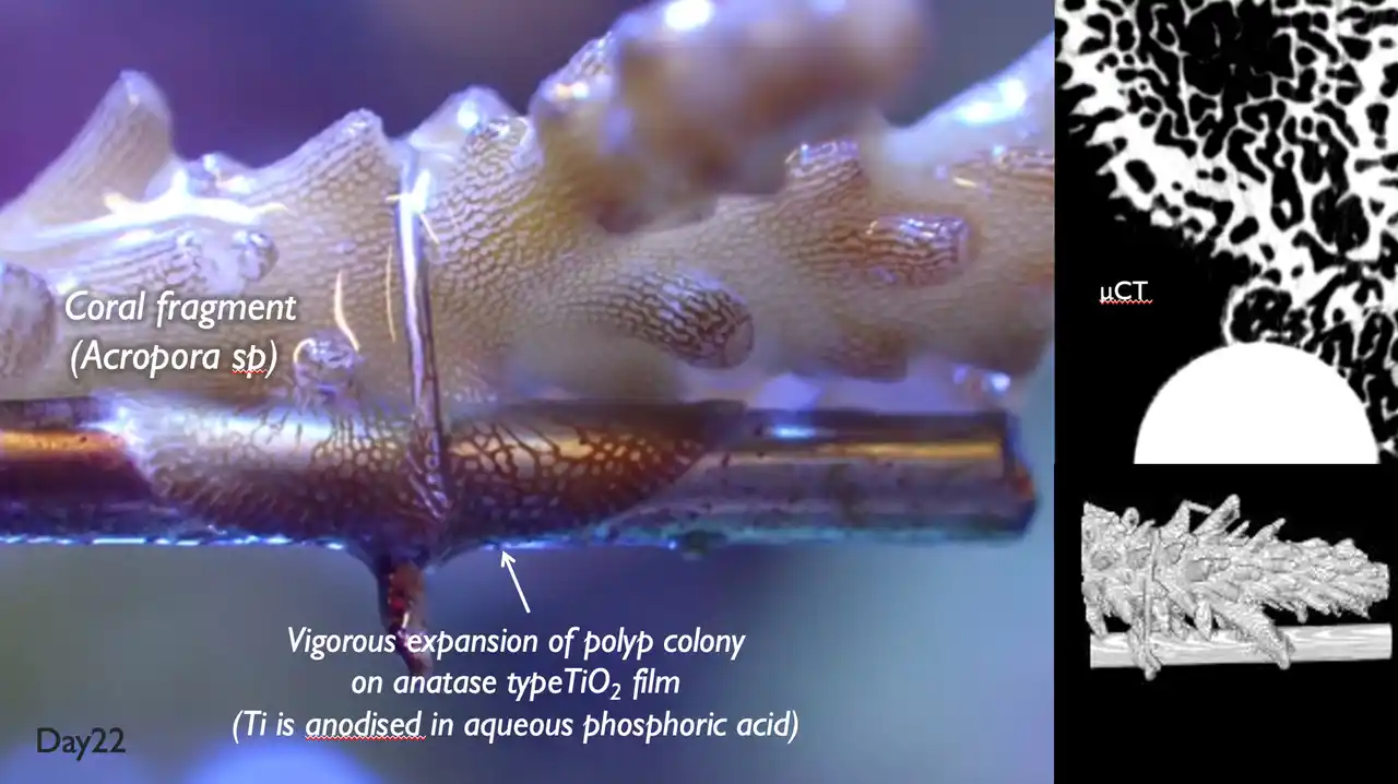 上田教授が開発を進めるのは、チタンなどの表面改質技術を活用し、サンゴの幼生・ポリプ(軟組織)が着生・成長しやすい人工基盤を創出する手法です。 |