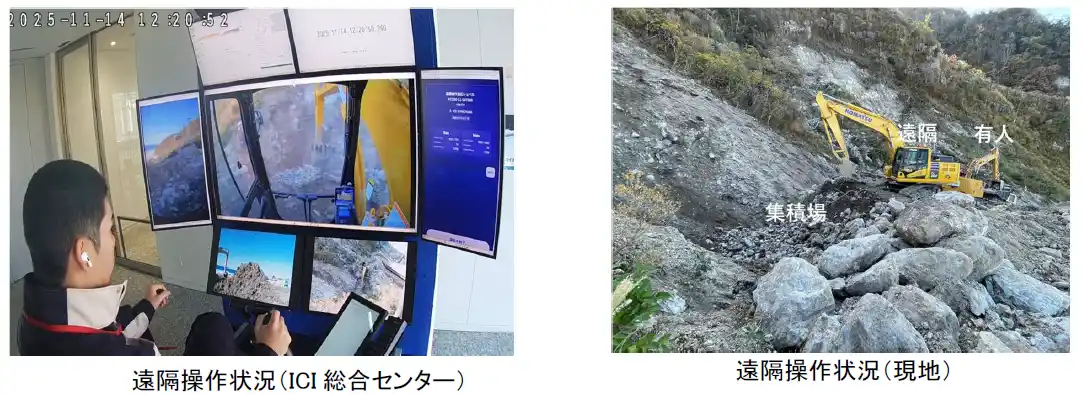 前田建設工業株式会社(本店:東京都千代田区、社長:前田操治、以下「当社」)と株式会社前田製作所(本店:長野県長野市、社長:伊藤正義)は、石川県珠洲市真浦町にて施工中の斜面復旧工事(国土交通省 北陸地方整備局 R6 249号珠洲地区道路復旧その2工事)(以下、「本工事」)での土砂集積作業において、約500キロ離れた茨城県取手市にある当社研究施設のICI総合センターに配備されているコマツと株式会社EARTHBRAINにて共同開発した遠隔操作システム「Smart Construction Teleoperation」を活用し、バックホウによる遠隔施工の実証を行いました。 |