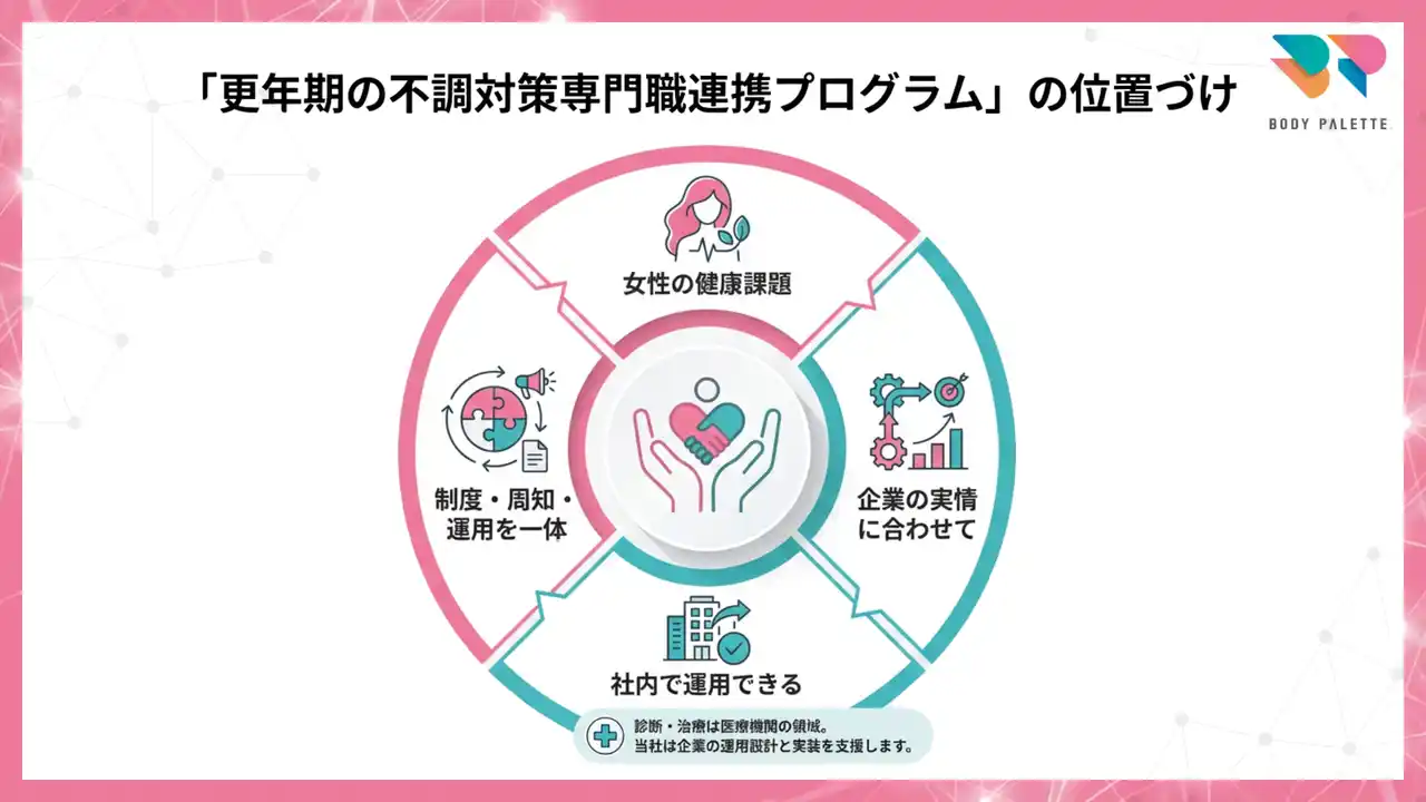 本プログラムは、女性の健康課題を起点に、企業の実情に合わせてテーマ設計と進め方を整理し、社内で運用できる状態を作るための支援です。 更年期の不調についても、教育だけで終わらせず、人事・総務と現場が迷わず動けるように、制度・周知・運用を一体で設計する支援を重視しています。 なお、診断・治療に関する判断は医療機関の領域であり、当社は企業の運用設計と実装を支援します。 |