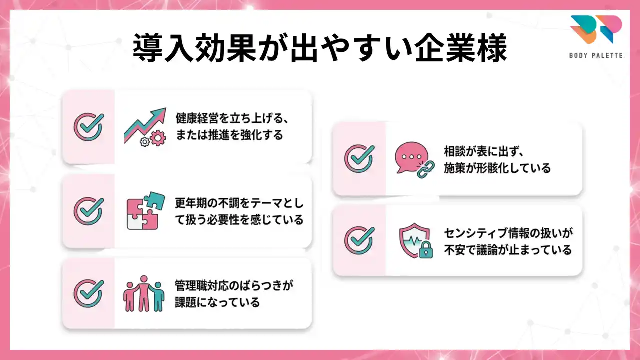 ・健康経営をこれから立ち上げる、または推進を強化したい ・更年期の不調をテーマとして扱う必要性は感じているが、制度と運用に落とせていない ・管理職対応のばらつきが課題になっている ・相談が表に出ず、施策が形骸化している ・センシティブ情報の扱いが不安で、議論が止まっている |