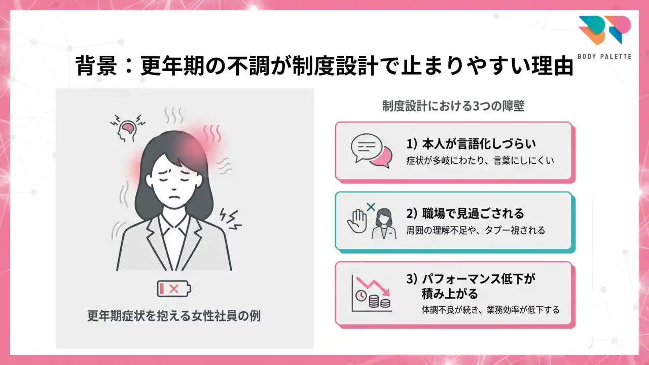 更年期の不調は「制度」だけ整えても動かず、「コミュニケーション」だけでも炎上リスクが残ります。 |