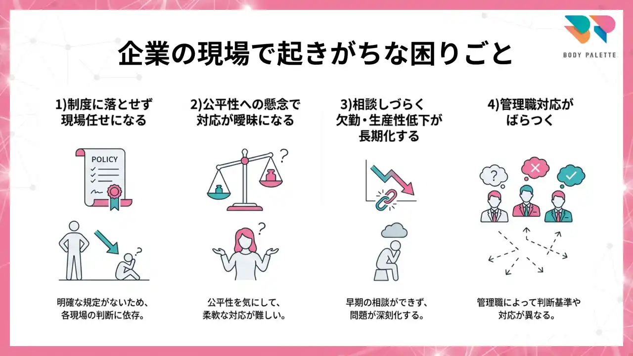 本人が言語化しづらいことも多く、職場では「体調不良」として見過ごされる一方、パフォーマンス低下や欠勤、離職リスクとして積み上がりやすいテーマです。 企業側は、配慮と公平性の線引き、センシティブ情報の取り扱い、管理職の対応のばらつきといった論点が絡み合い、制度や運用が固まらず、議論が止まりやすくなります。 |