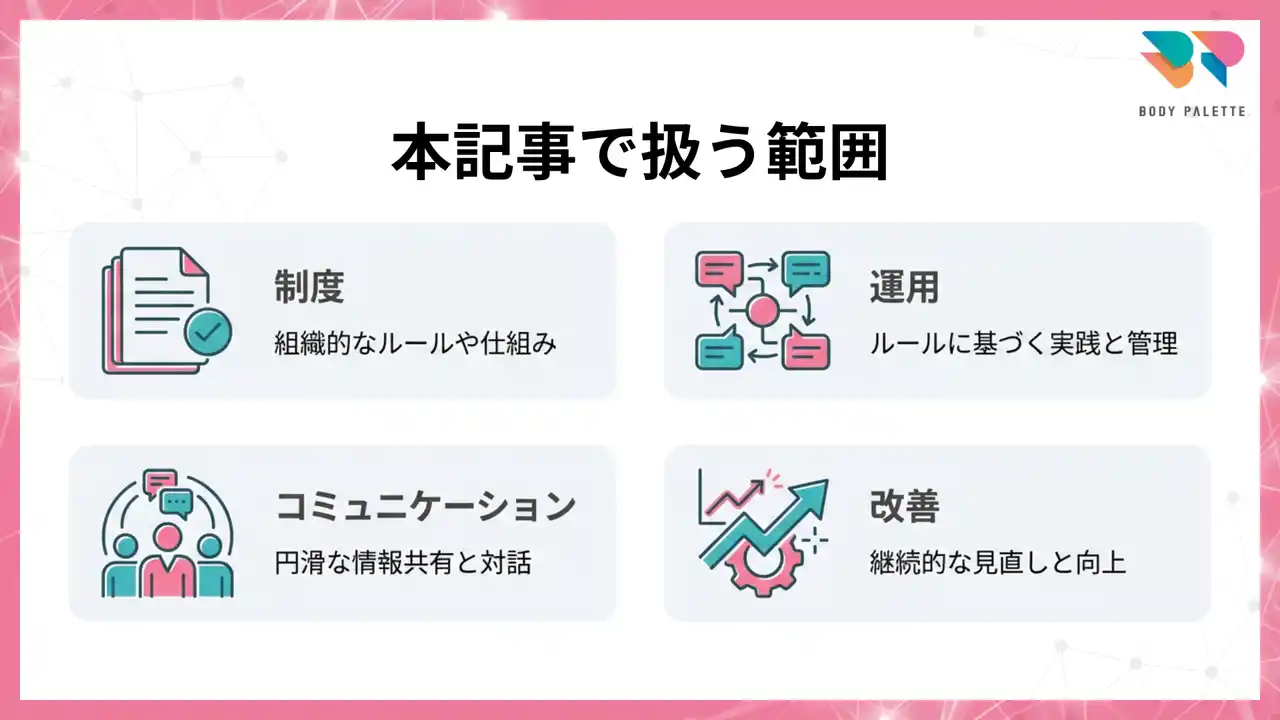 特に次の論点が未整理なままだと、推進が止まりやすくなります。 ・対象と範囲:誰を対象に、どこまでを職場のテーマとして扱うか ・配慮と公平性:例外対応の扱い、現場負担とのバランスをどう置くか ・守秘と共有:相談時に何を記録し、誰にどこまで共有するか ・管理職の役割:踏み込み過ぎずに支えるための基本方針をどう置くか ・周知の設計:誤解や反発を生まない伝え方、伝達の優先順位をどう設計するか ・改善の仕組み:運用開始後に何を点検し、どう見直すか |