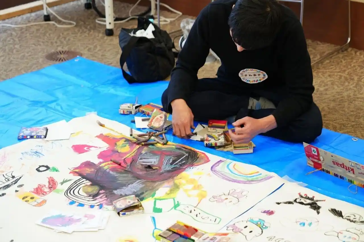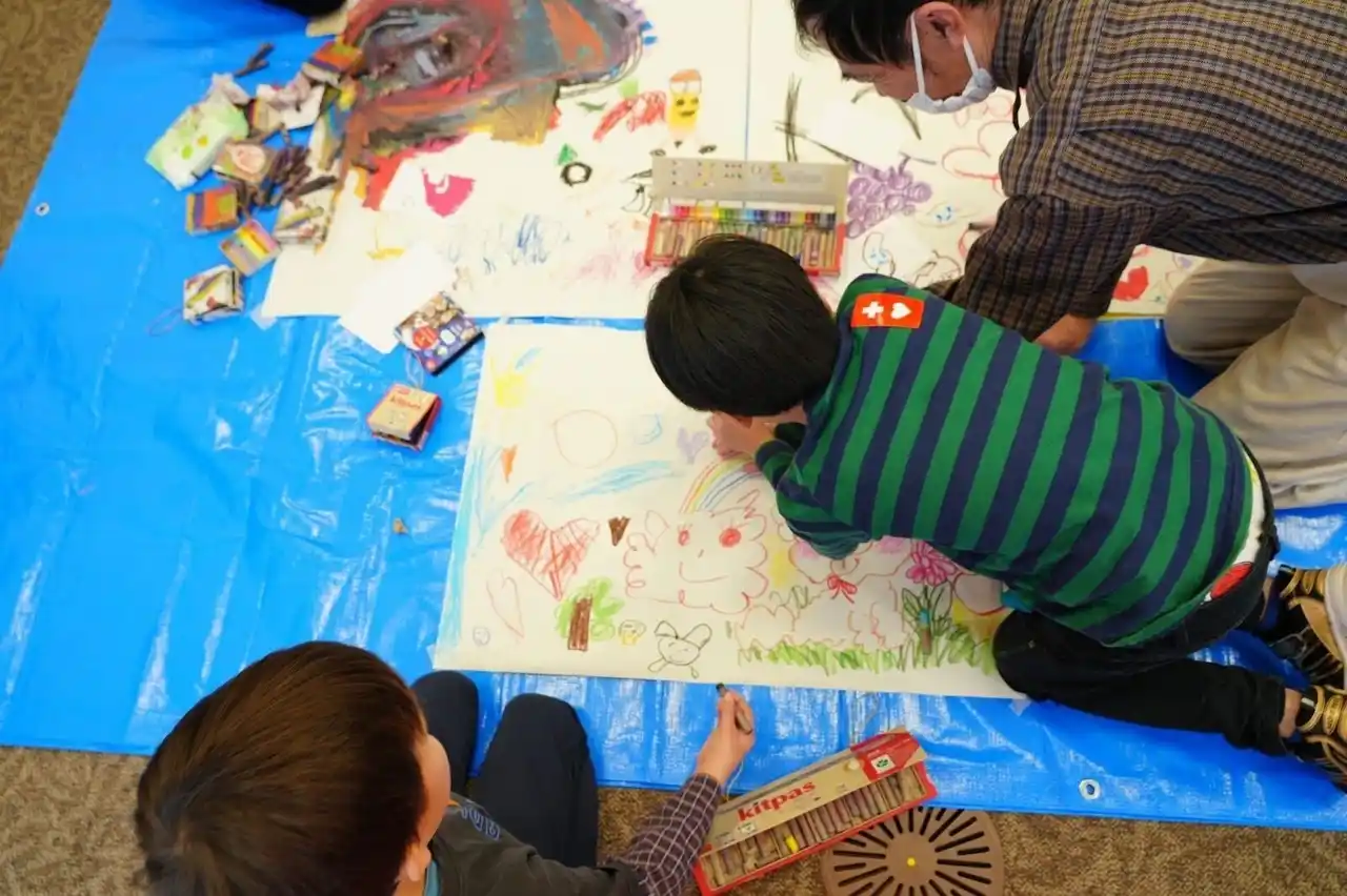 イベントのクライマックスは、ワークショップの後に行われた、子供たちによる「お絵かきコーナー」の作品発表会でした。 一人の参加者の子供が、一度描いた絵の上から色を塗りつぶし、さらにそれを濡れふきんで拭き取ることで、下の絵柄を浮かび上がらせる独特な表現を行っていました。一般的には「せっかく描いたのに」「汚している」と捉えられかねない行動です。 |