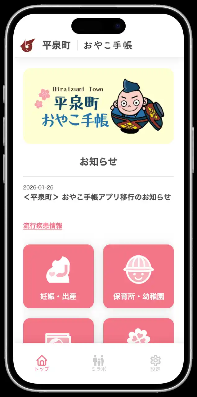 岩手県 平泉町では、2017年よりミラボが開発・提供する母子手帳アプリをベースとした「ひらいずみ 子育て応援ナビ」を提供し、長きに渡り 子育て支援事業に取り組んでおります。 |