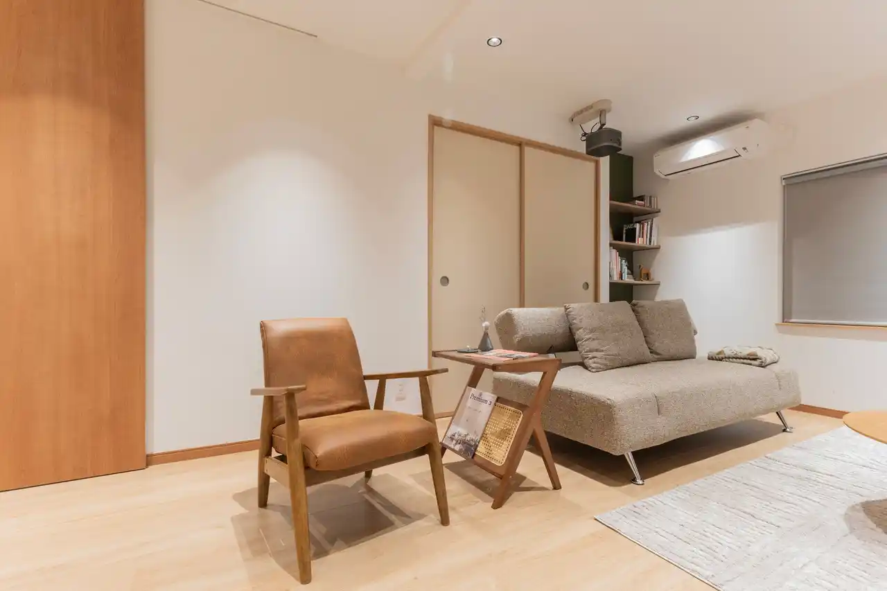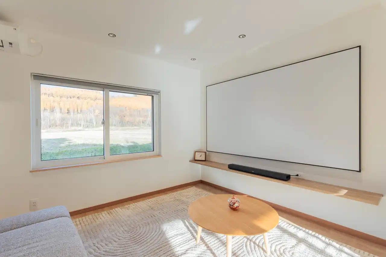 リビングには100インチのプロジェクターを備えています。外に出れば星空、室内に戻れば映画。にぎやかな娯楽というより、ご家族やご友人などと同じ画面を眺めながら自然に会話が生まれるような、静かなエンターテインメントをご用意しました。 |